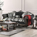 RONJA Sofa, 94"L X 37"W X 44"H, 180lbs. This salon-inspired sofa from the Ronja Collection will add sophistication to your living room. This sofa is one-of-a-kind, with a curvy design, button tufting, and dapper damask fabric on the reversible box cushions. Each plush cushion is encased in black welting, and the rolled arms feature wooden accents, creating an antique refinement perfect for the focal point of your living room.