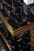 Cosmos Furniture's Tahira modern style marble top Coffee Table with metal finish is a unique geometric base. Bring home the sleek and stylish this Coffee Table and enhance your living room space. This end table sports a unique contemporary structure and is a fine example of substance and style. Beautiful and sophisticated, this table is the perfect choice for a contemporary setting. It features a black faux marble tabletop which is supported on gleaming gold geometric linear metal base and additional storage space shelf beneath the table top offers a hint of glamour and modern styling. This elegant table will surely add a spark of life to any home decor. The table blends with your interior furnishings and color combination and complements any personalized home decor, giving it a modern outlook. This table is perfect for all room sizes whether big or small and can be kept in your living room, study, foyer, or bedroom. The base of this Coffee Table is constructed of metal that provides its maximum durability and a robust structure. The top of the table is framed in faux marble for a sophisticated look and display. The table comes with uniquely designed sturdy legs that ensure maximum balance and stability. Matching End Table is sold separately.