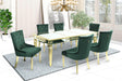 Queen Gold Modern Style Dining Table in Gold finish Wood, 30 x 42 x 78, 165lbs. Cosmos Furniture's Queen Gold modern style Dining Table in gold finish wood is crafted with past and present in mind. Queen Gold dining collection revitalizes and transforms designing ideas. A grand centerpiece, the rectangular table is handsomely finished and enriched by tapered legs, mirror insert top and edges. Paired with button-tufted backrest chairs makes the whole set an eye-catching one. This will be the best collection for your dining room. Matching Queen Gold Dining Chairs in green velvet fabric and gold finish are sold separately. - Modern Style Dining Table - In Gold finish Wood - Mirror Trim with Mirror finish - Seats up to 6 - Sturdy and easy on eyes - Matching Dining Chairs sold separately - - - - - -