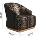 Elevate your living room to new heights of modern luxury with our striking living room set. This meticulously crafted collection is designed to infuse your space with an air of contemporary majesty. Embrace the essence of modern royalty in your living space with this exceptional set. Black and gold color accents for a bold aesthetic. Shiny velvet fabric offers a luxurious texture. Unique overlapping fabric on the back adds an artistic touch. Snake print on legs with gold accents provide a character and glamor. Chair features a full gold accent base with intricate floral patterns on velvet upholstery.