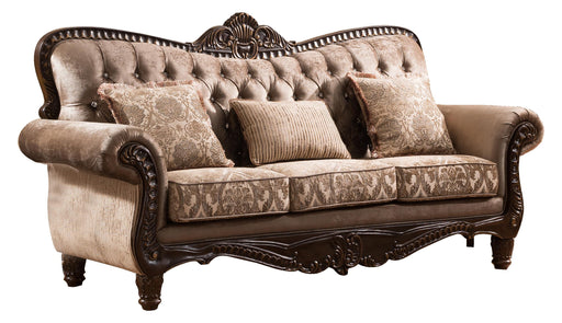 Cosmos Furniture's Giana traditional style Loveseat in cherry finish wood. Founded atop arrow foot legs, this loveseat's frame is constructed from solid carved wood in a cherry finish and is wrapped in coffee colored silk and chenille upholstery. Eye-catching updates, such as rolled arms, crystal button tufting, piping trim, and a gently curved camelback seats, round out the design. Plus, with designer throw pillows this design is a great way to dress up the living room. Throw pillows are included. Matching pieces are sold separately.
