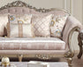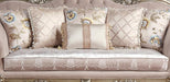 Cosmos Furniture's Ariana traditional style Sofa in champagne finish wood. This beautiful elegant sofa set blends classic French and European inspired Victorian-era elements into one. The luxurious champagne finished, button tufted back and plush seat support you in lavish comfort and extraordinary style. The intricately carved solid wood frame outlines the gracefully curved rolled arms. The Ornate carvings with metallic highlight to the detail work cascade across the skirts. Add this beautiful set to your living room to create a romantic and stylish space that everyone will admire. A scrolled floral motif adorns each piece in this addition to our exclusive design collection. Queen Anne Legs complements the whole look to brighten your living room. Throw pillows are included. Matching pieces are sold separately.