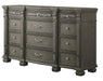 Cosmos Furniture's Silvy transitional style Dresser in gray finish wood is the perfect accent to create the royal statement for your bedroom. This twelve (12) drawer Dresser is crafted with intricate detailed carvings and a gorgeous lightly brush kissed gold on salvaged natural wood finish accentuates this piece. The hand applied brush finish enhances the beauty of the detailed woodwork carvings. It has nine (9) deep bottom drawers and three (3) top drawers are for your jewelry or accessories. Exceptionally beautiful intricate detailed carvings and gorgeous hand brushed Gold finish on the Dresser accentuates the brass finished crystal encrusted hardware on the drawers. The wood box deep drawers have dovetail construction with full extension glides. Also, the bottom drawers are dust proof. Elaborated detailing will surely bring true splendor into your home. Crafted with a transitional it is an ideal for someone looking for a contemporary traditional look. This fashionable Dresser will fuse with the surrounding decor and transform a room from ordinary into something interesting and sophisticated. Matching Mirror and other bedroom pieces are sold separately to complete the entire look of your excellent taste.