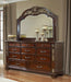 Cosmos Rosanna Mirror in Dark Cherry. Saving Grace. Give your bedroom all the grand eur and grace of American colonial style with our Cosmos collection. Presented in a stately dark cherry finish, each piece has a substantial silhouette and is adorned with such old world details, carved medallions, shaped mouldings and intricate scrollwork. The bed features a soaring headboard with a padded selected PU panel and on footboard, whose curves are echoes in the shaped fronts of the dresser, nightstand and chest for a carefully coordinated look.